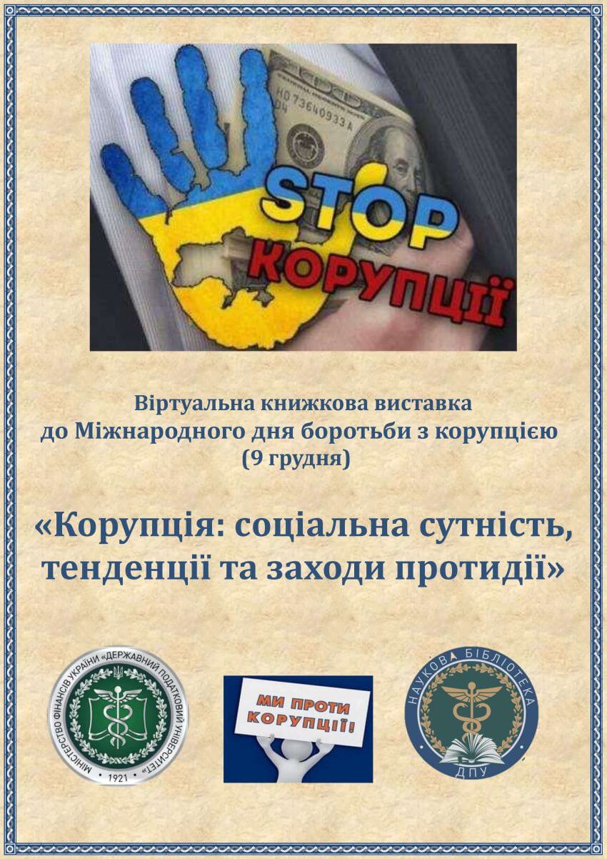 Наукова бібліотека Державного податкового університету долучається до відзначення цієї важливої дати та презентує виставку літератури «Корупція: соціальна сутність, тенденції та заходи протидії».