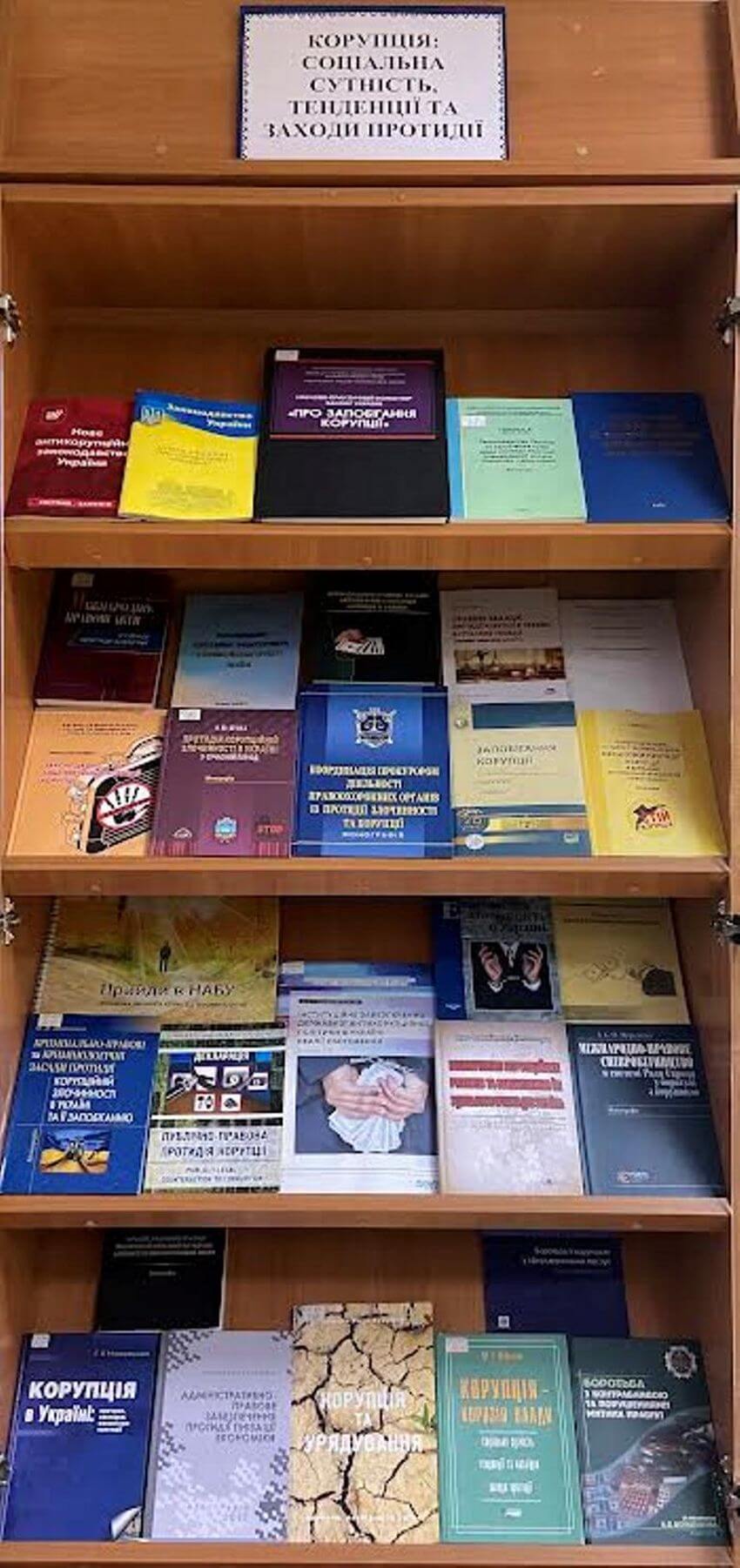 Стаціонарна книжкова виставка на абонементі навчальної літератури (корпус С, кім. 372) – друковані видання: навчальні посібники, підручники, аналітичні матеріали та наукові дослідження викладачів і експертів у сфері протидії корупції та забезпечення доброчесності в органах влади.
