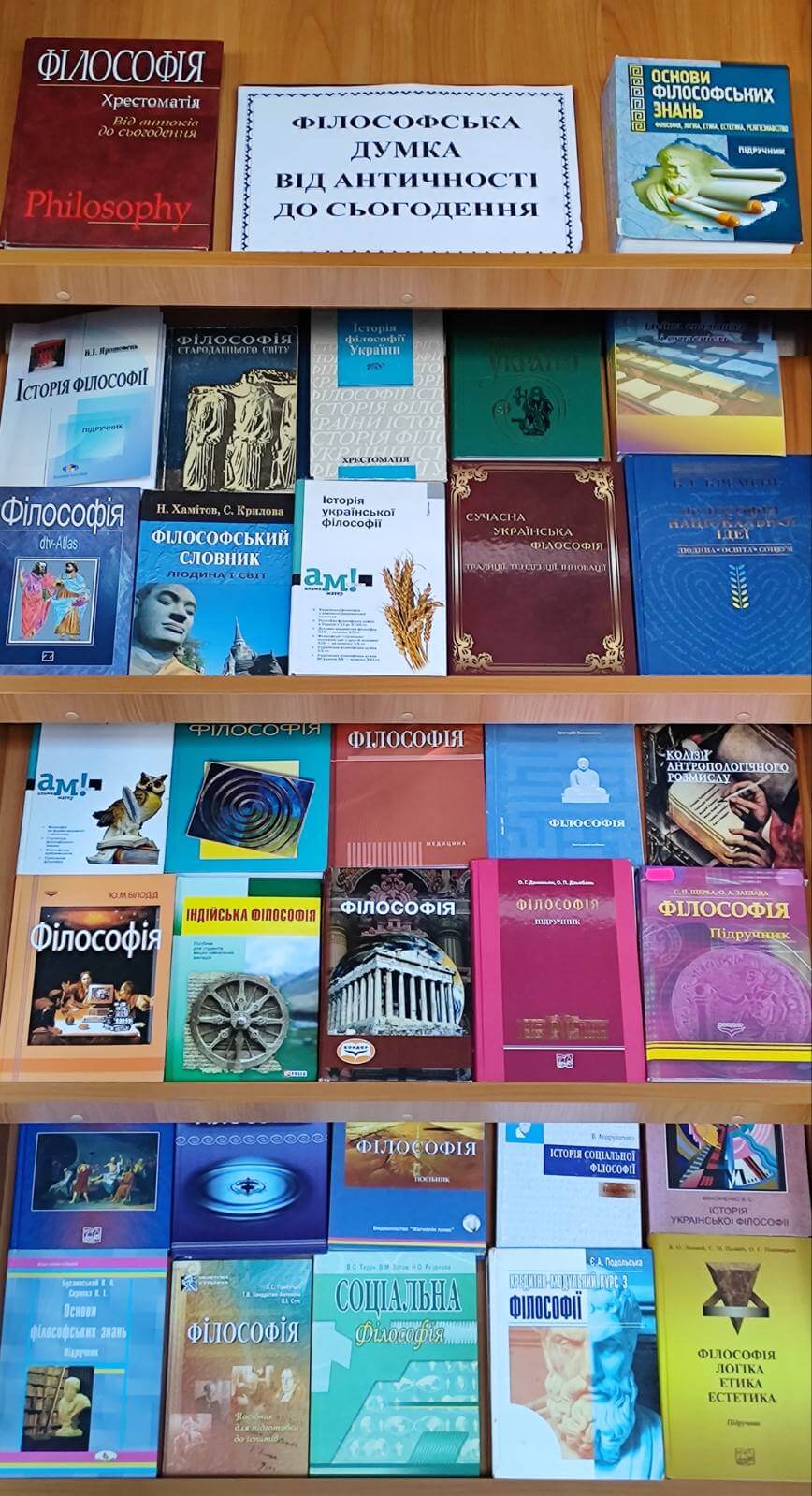 З нагоди свята у Науковій бібліотеці (кім. 372 корпусу С) експонується книжкова виставка «Філософська думка від античності до сьогодення», яка містить низку актуальних різнопланових видань, ілюструє історичний розвиток та багатогранність філософії в нашому житті, зокрема, акцентує увагу на українській філософії, розуміння та розвиток якої, поряд зі збереженням та розвитком української ідентичності, мови й культури, є вкрай важливим у ці непрості часи для нашого народу.